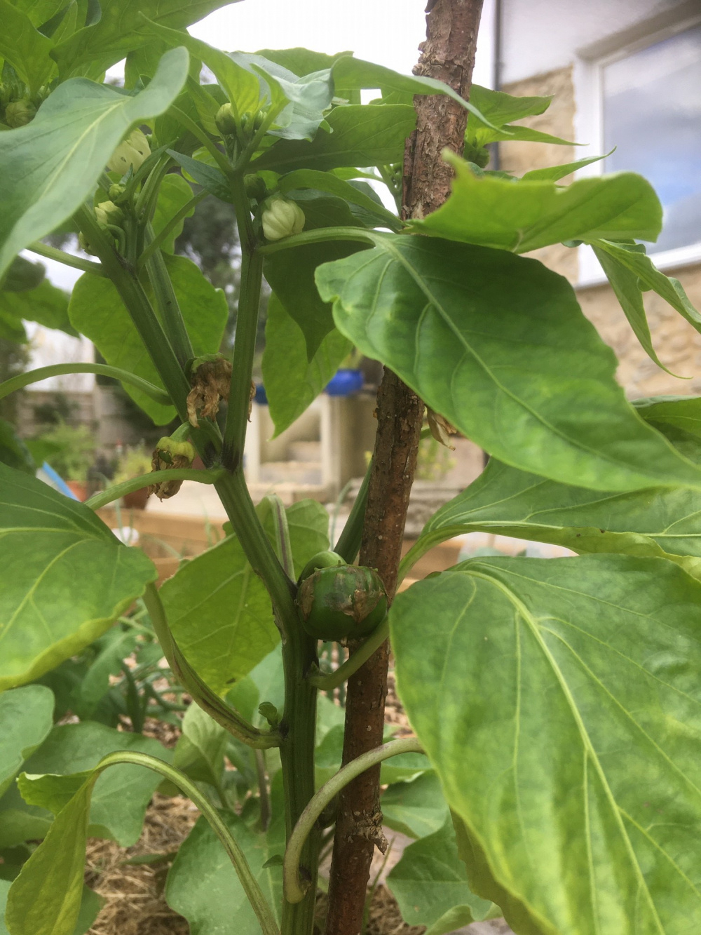 This is my pepper. Looking fairly strong and is producing its first pepper. But again, is there enough time in the year for it to fruit do you think? If not, Ill bring it inside as a houseplant.