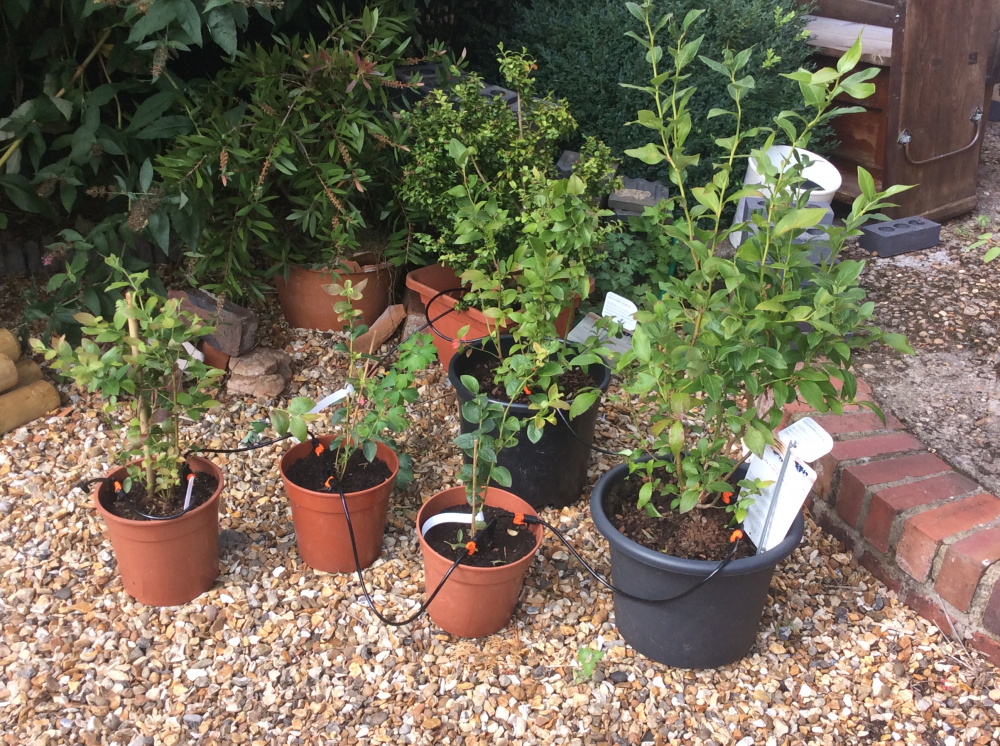That is, some blueberry bushes bought between late May and July, all of which have now doubled in size after repotting. A couple even gave me a few blueberries. Though I am still waiting for a couple from Primrose.