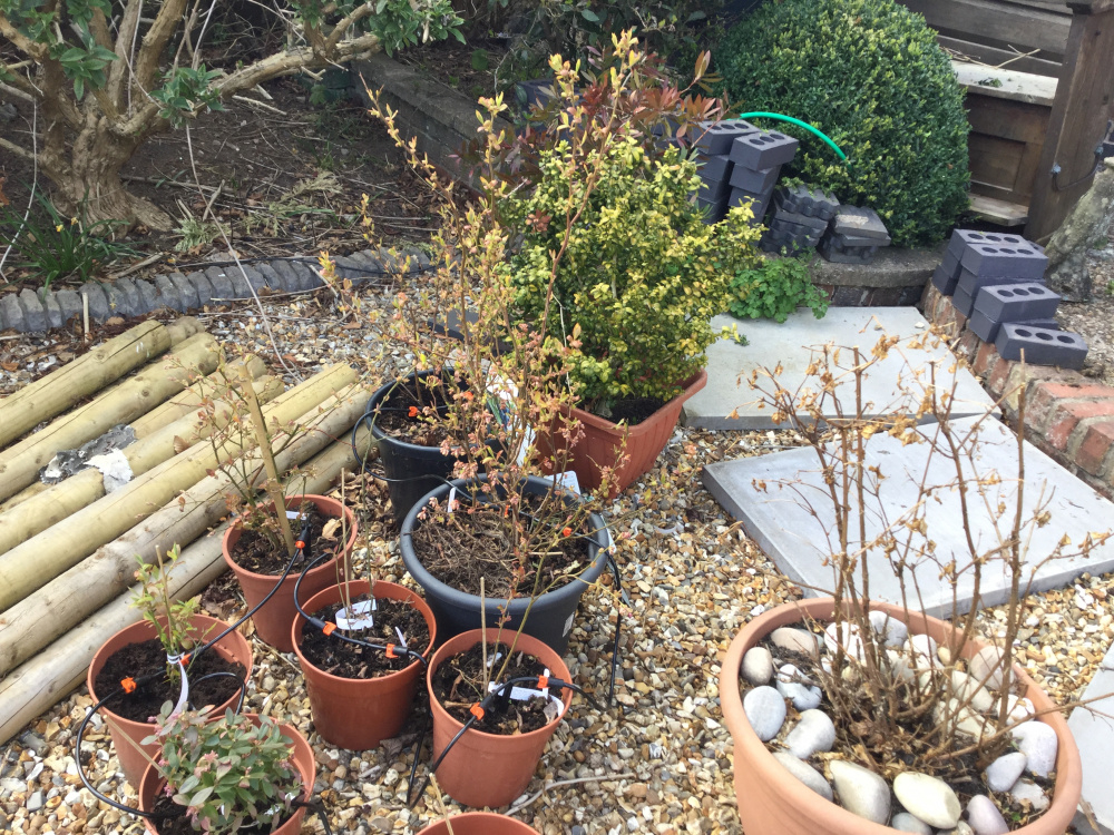 On The LHS is a Sunshine Blue blueberry, which is looking amazing. But it is supposed to be an evergreen so should be looking good. I think it is also a bushier variety.