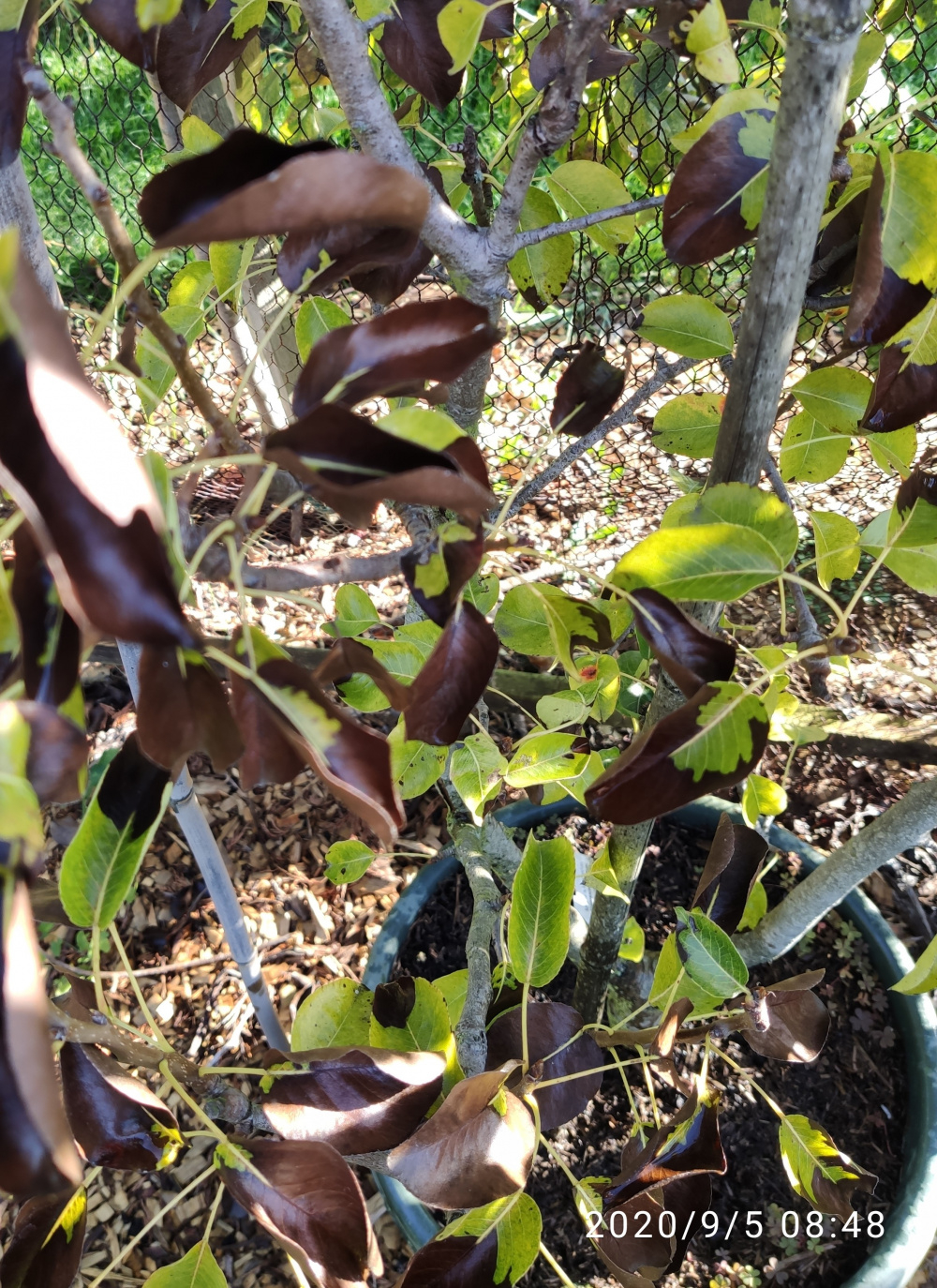 Any ideas what has happened to my pear tree? It is in a large pot but I keep it well watered. A few days ago I noticed the leaves looked a bit limp so gave it another drink, but literally a couple of days later the majority of leaves have suddenly turned this chocolate brown colour! Is it just that it briefly dried out, or is it a disease - and if it is a disease, will the 4 pears I have be safe to eat? Thanks in advance!