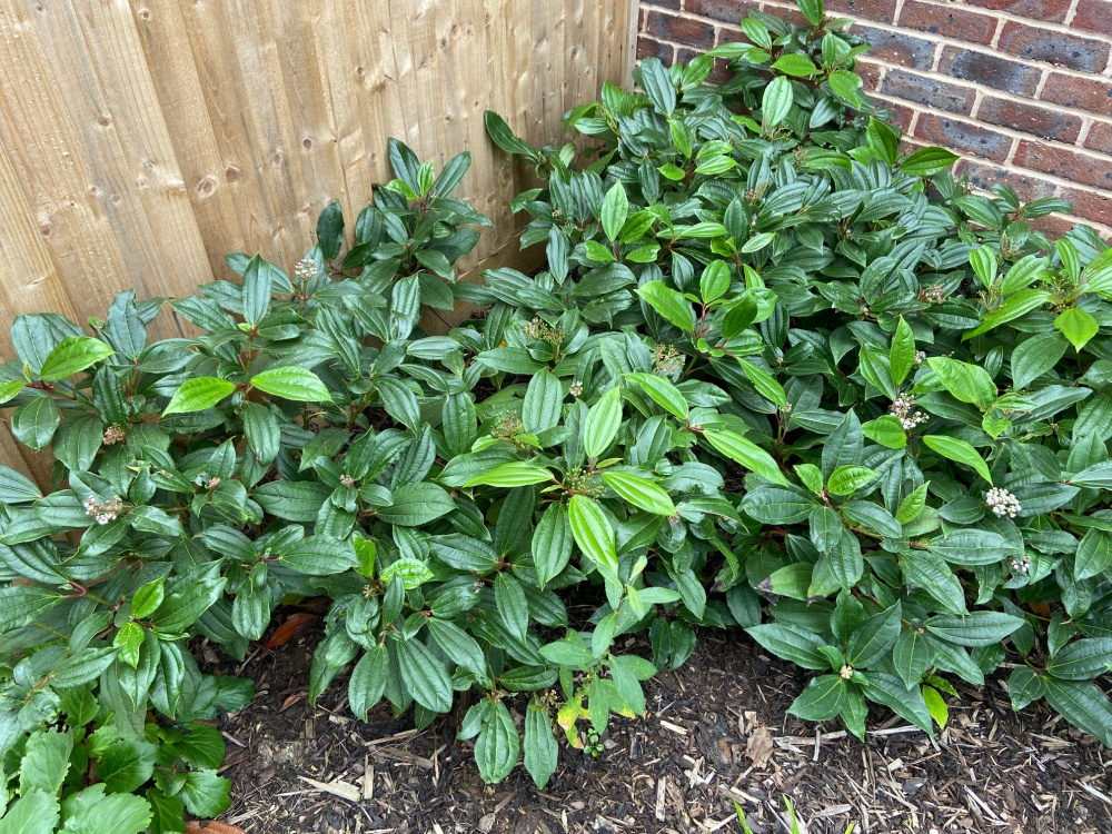 I may be completely wrong but I think 1 is a laurel, 2 & 3 are both different varieties of viburnum.