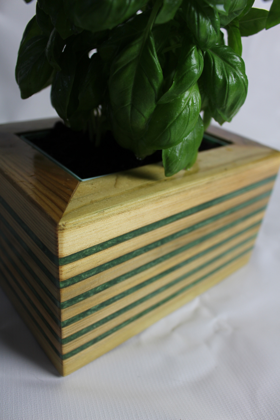 It’s made from a reclaimed bit of decking, a 3D printed soil basket and drip tray and epoxy resin inlays. It fits perfectly on my windowsill.