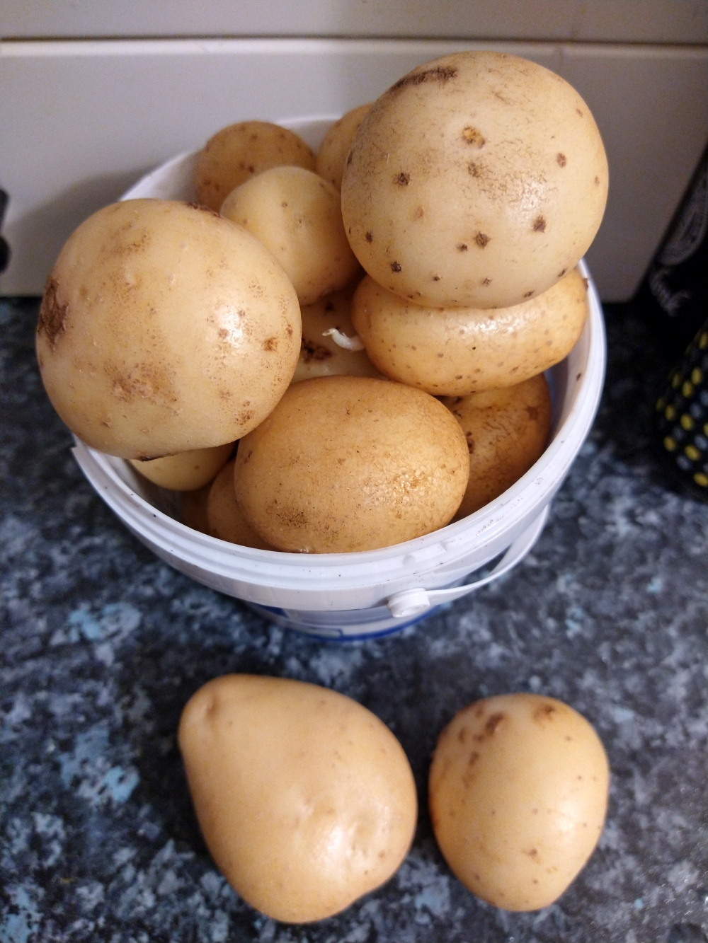 I decided to get some compost out of the plastic dalek today. I knew there were some potatoes growing in it but I found more than I expected. We had a few for dinner and they were fine.