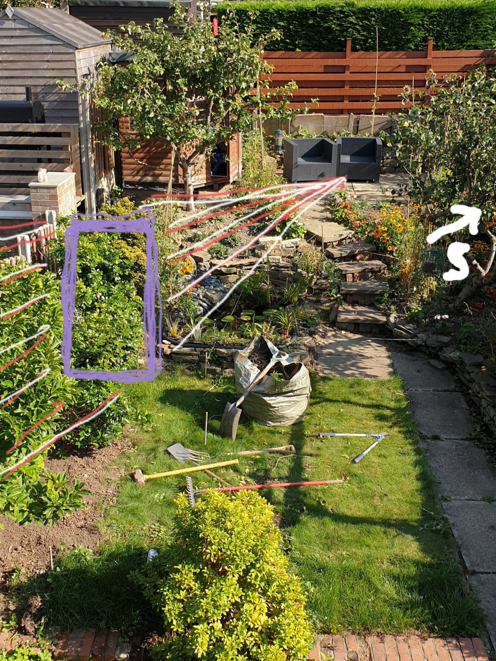 I have a dilemma, with which I'd be very grateful for some help from you far more experienced gardeners. It is a "which tree for this scenario?" query. The site, within my small 18x15m garden, currently looks like this (with the mess having been created today from me having cleared out some shrubs in the border):