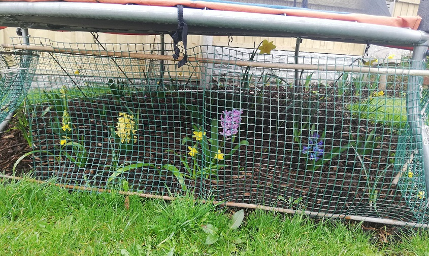Spring was a good result. Plenty of bulbs came through and just added a bit of colour under there. @Biglad in answer to your comment, we did accidentally put a couple of 'regular' daffs in, which must have had quite a headache from the bouncing! The mesh was put up while the spaniel pups learned not to venture under!