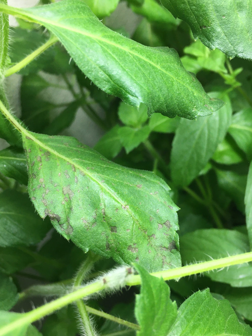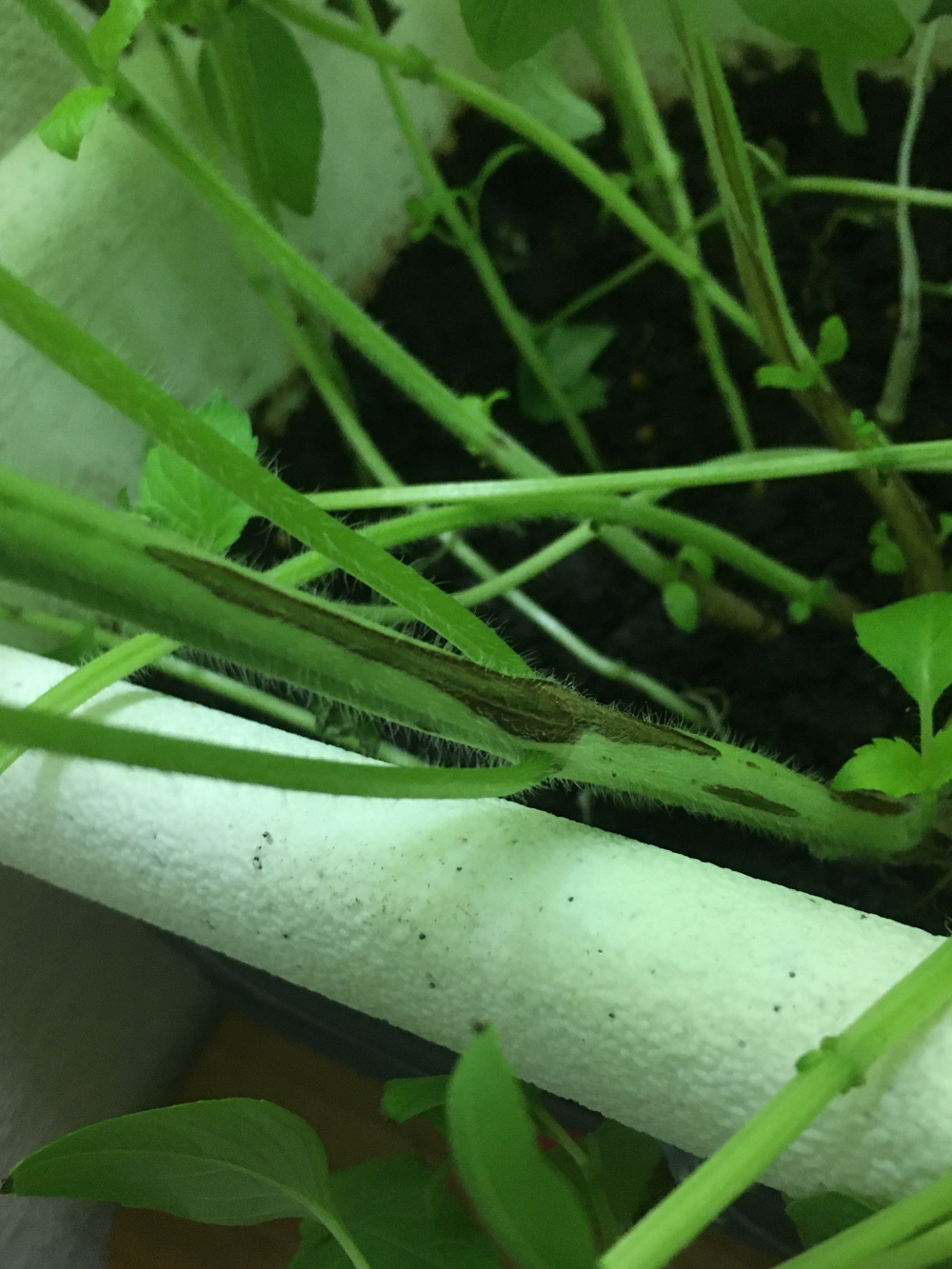 Weird brown marks/spots on basil stem and leaves (indoors)