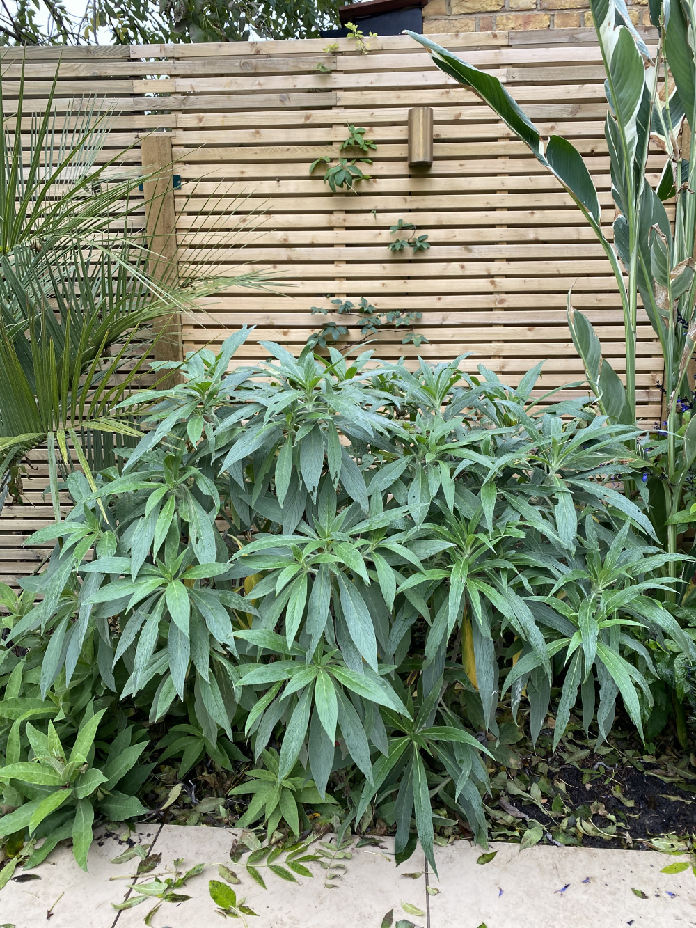 You can see the Echiums, a glimpse of the Butia capitata and Ensete maurelii, lobelia tupa, akebia, and canna lily. All rather exotic and requiring a lot of care, but definitely worth the effort!
