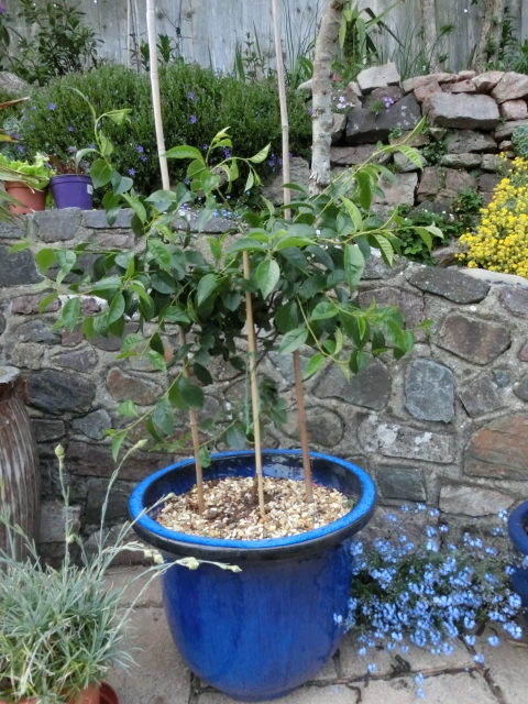 My Cherry bush has come on quite nicely in its first full year. I transplanted early spring into this large blue pot and seems very much at home. It faces due south and gets the sun throughout the day. I had about three flowers on it earlier on but they have now gone. It is 75cms tall and branches spreading out sideways, so much so I have put in a couple of canes either side to give it a more upright growth; hope that was OK. I keep it moist but wonder how often to feed it and what with. Having purchased and set up four water butts holding a total volume of 600 litres of rain water, I have a ready supply of water. Any advice would be gratefully accepted to a budding gardener.