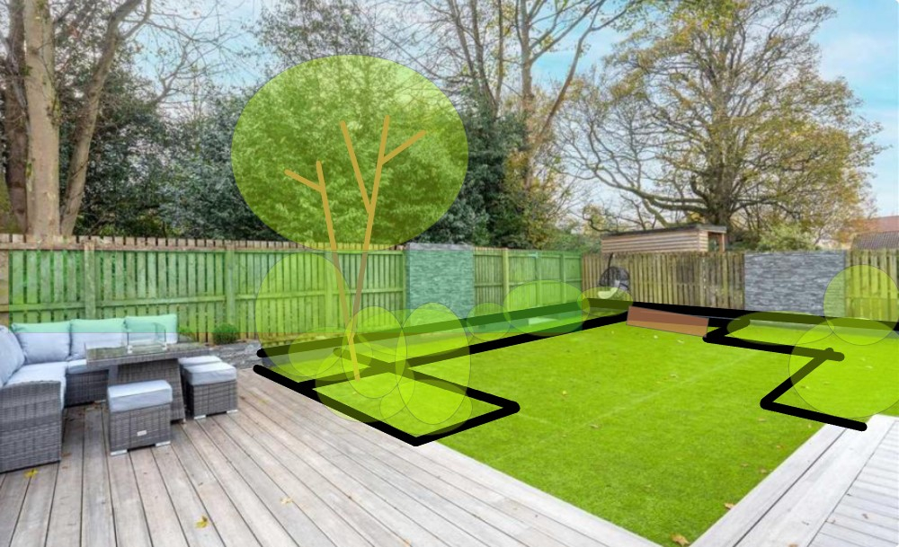 I just cant work out what to do with the "lawn" area as it takes up all of the available planting space and I feel like cutting strips around the outside will be unsatisfying. The straight lines are not what I would normally go for but it does work with the modern house so I'm thinking about cutting a different shaped bed into each corner. When I have the shape right I can replace the astroturf.