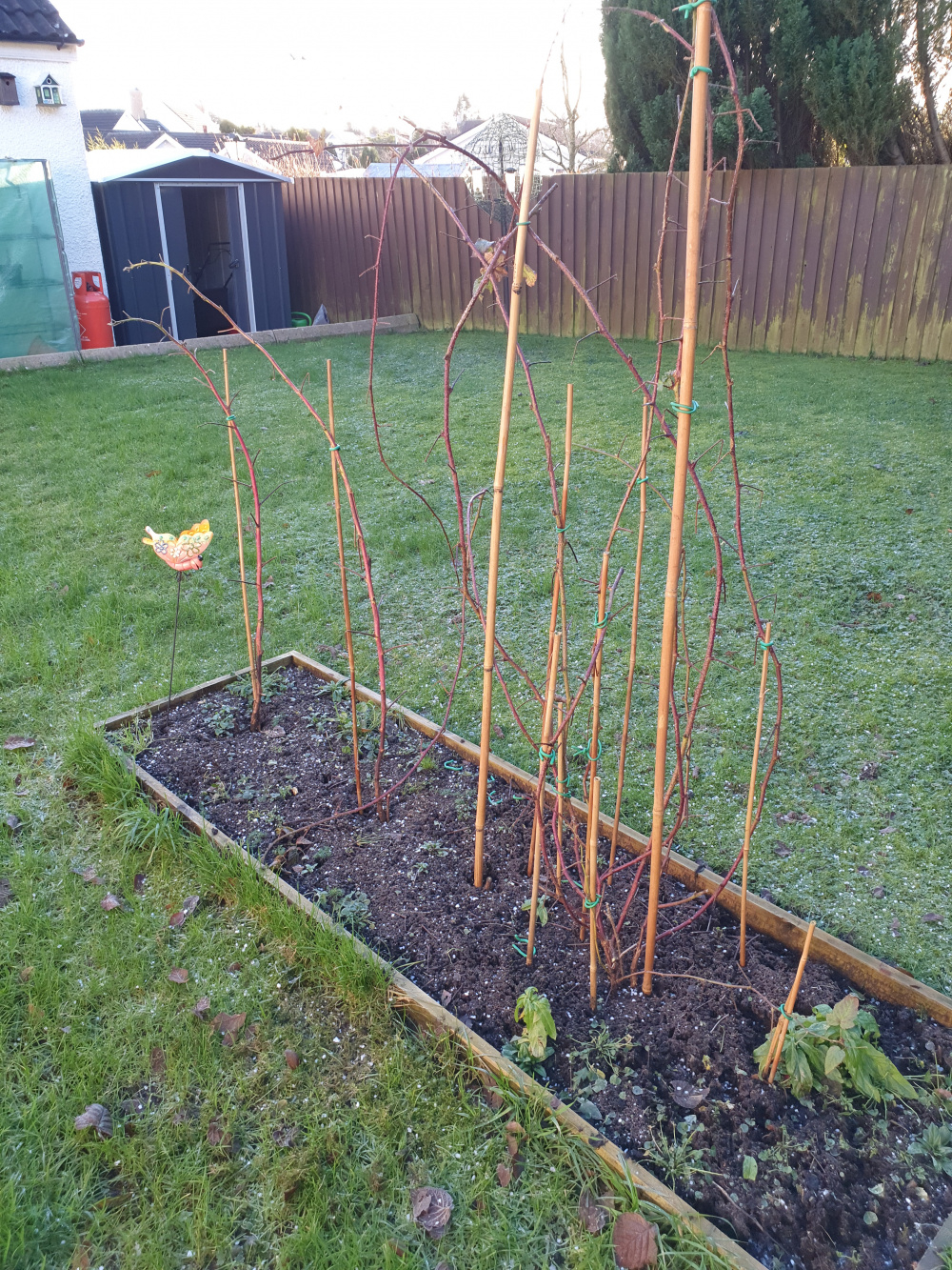 Hi folks, I started last year with a bit of gardening, but as its fast approaching growing season again I need some advice. I planted raspberry canes and a tayberry cane last year, none of which produced any fruit. The shoots came up to about 6 foot+ and I had to trim. U will see in the photo how they look, do I have to cut them right back or will I just leave them? Also when will I starting working in the manure to the soil so they get food?