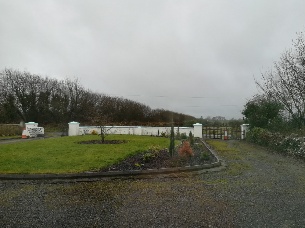I like the idea of having the pair of tree at each end rather than framing one gate, but I don't think we'd fit the fourth tree on the far right as the drive is quite narrow. There is actually a stone wall with ivy growing over it along that drive, which you can't quite tell in that picture. I've uploaded another one below which should help you see what I mean.