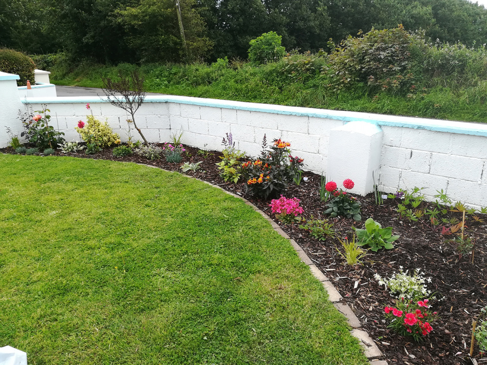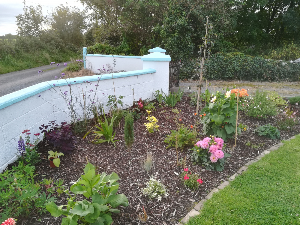 These pics are to show how the beds looked in the summer. We dug these beds ourselves in spring. You can see the Cornus Kousa, it has a long way to go before it's a decent size tree. I love pinks and oranges so I have a warm colour palette with pops of purple.