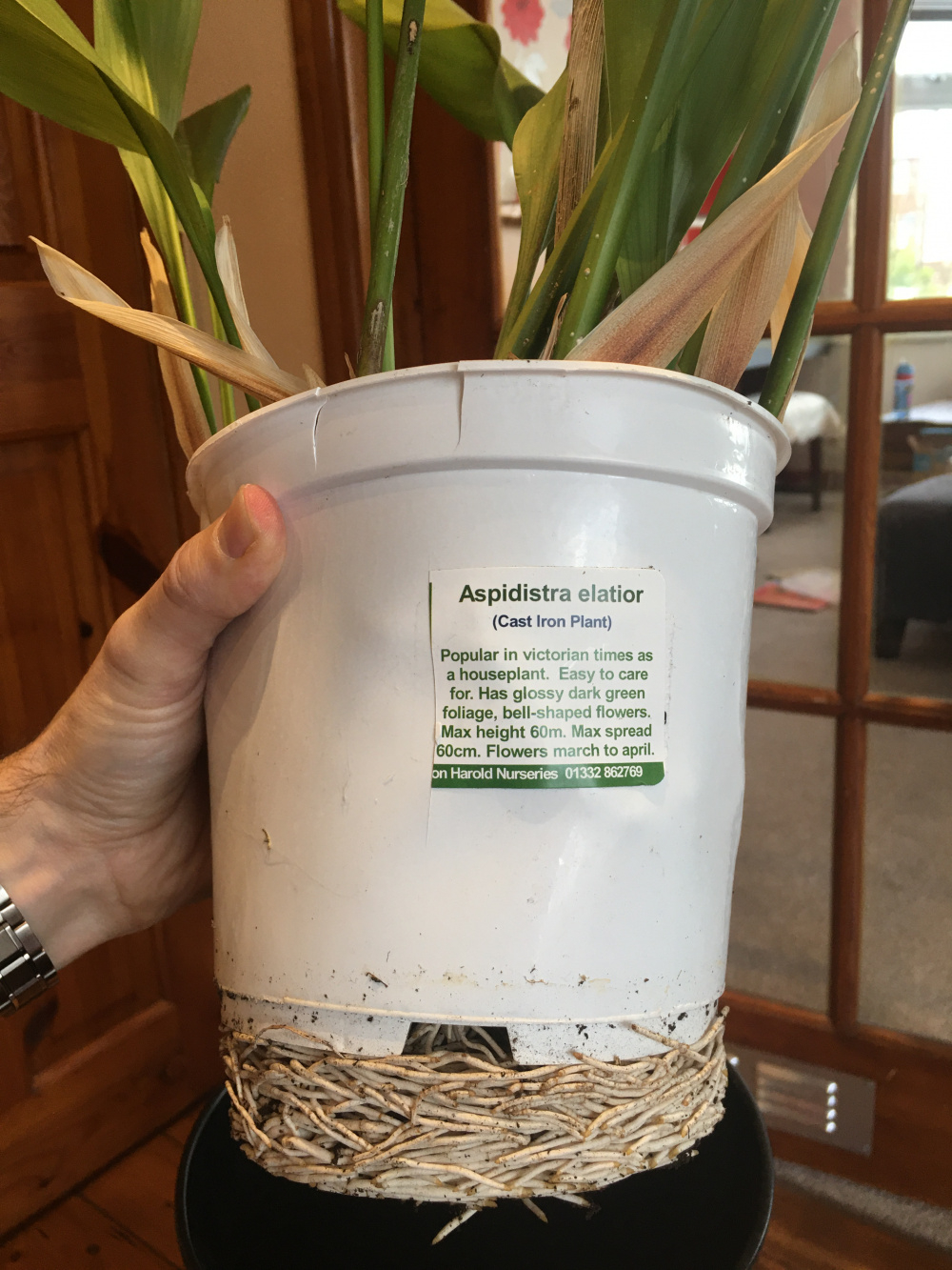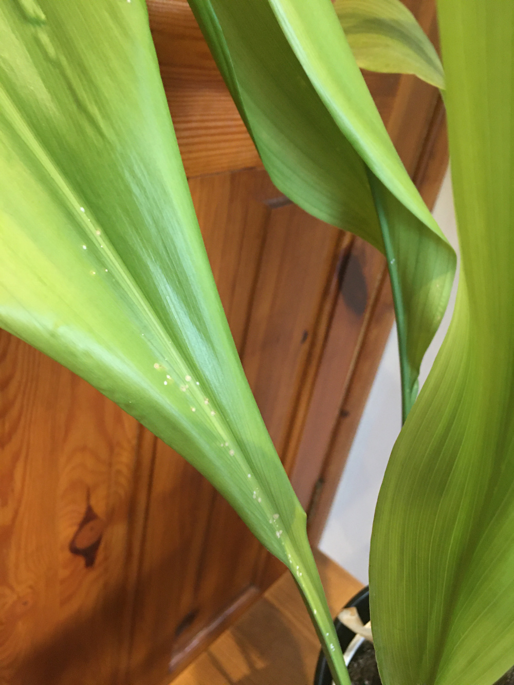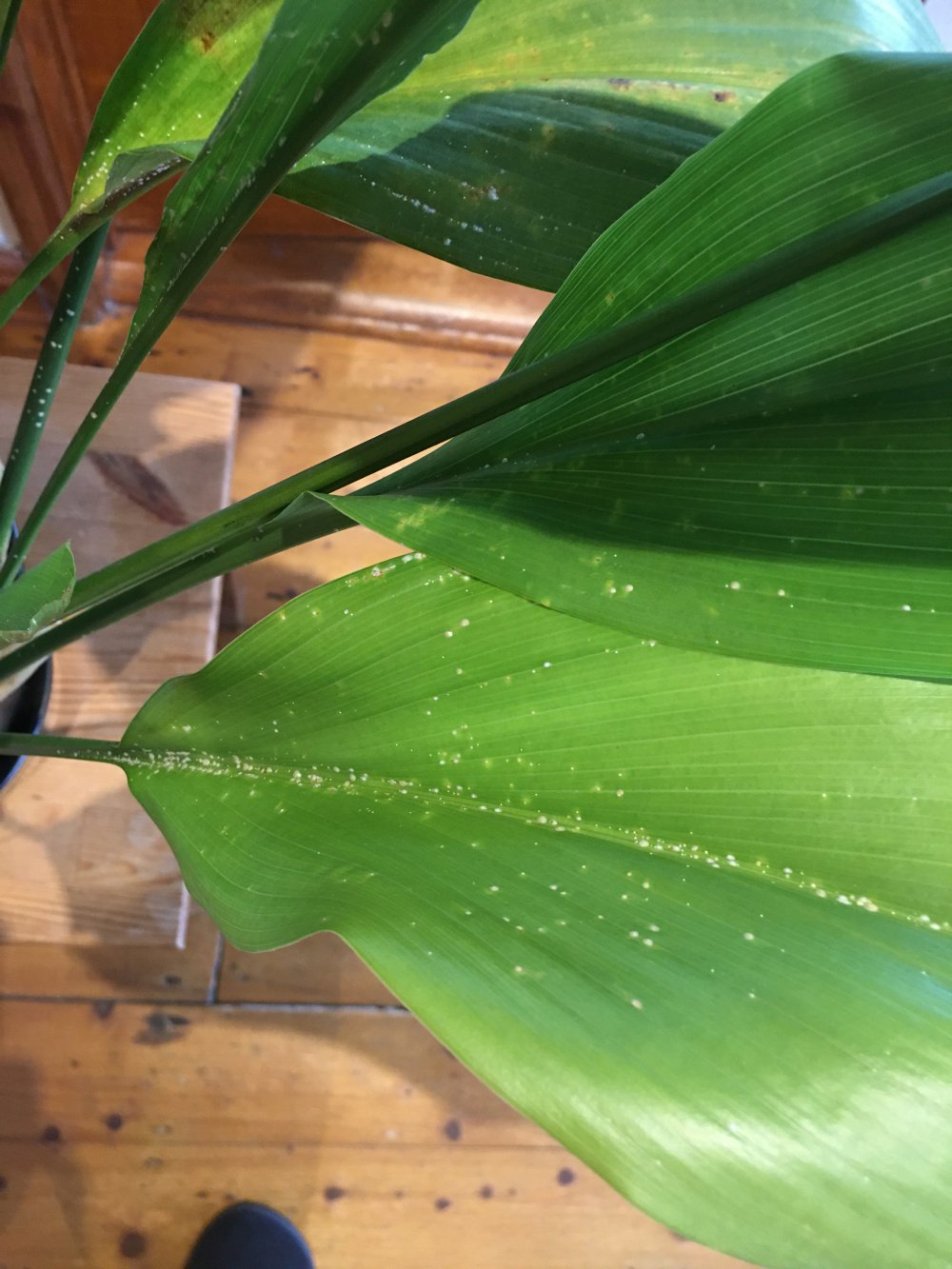 Pot-bound Aspidistra looks anaemic and has white spots on leaves