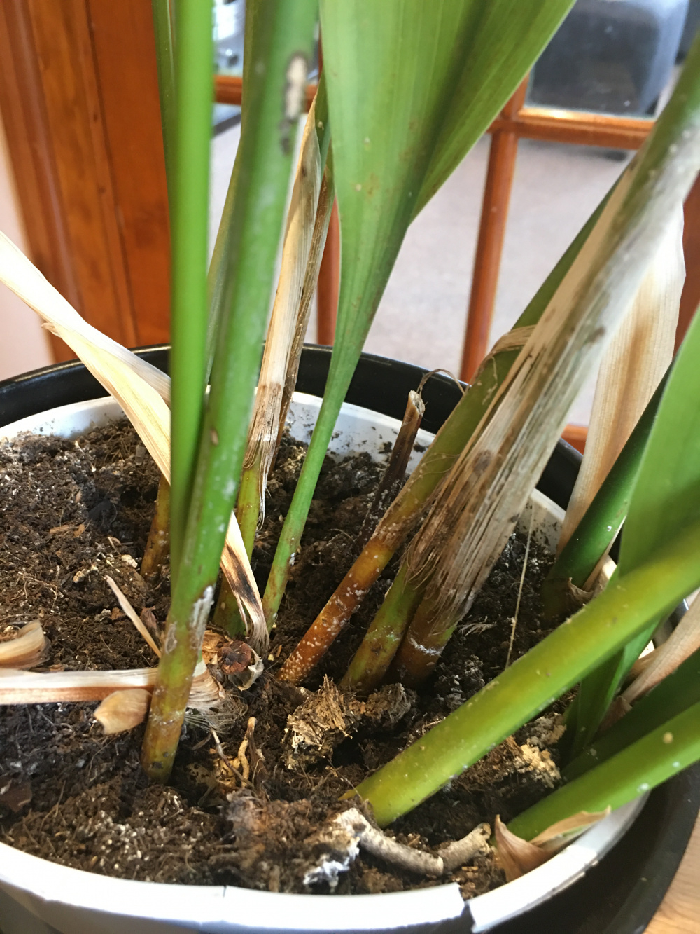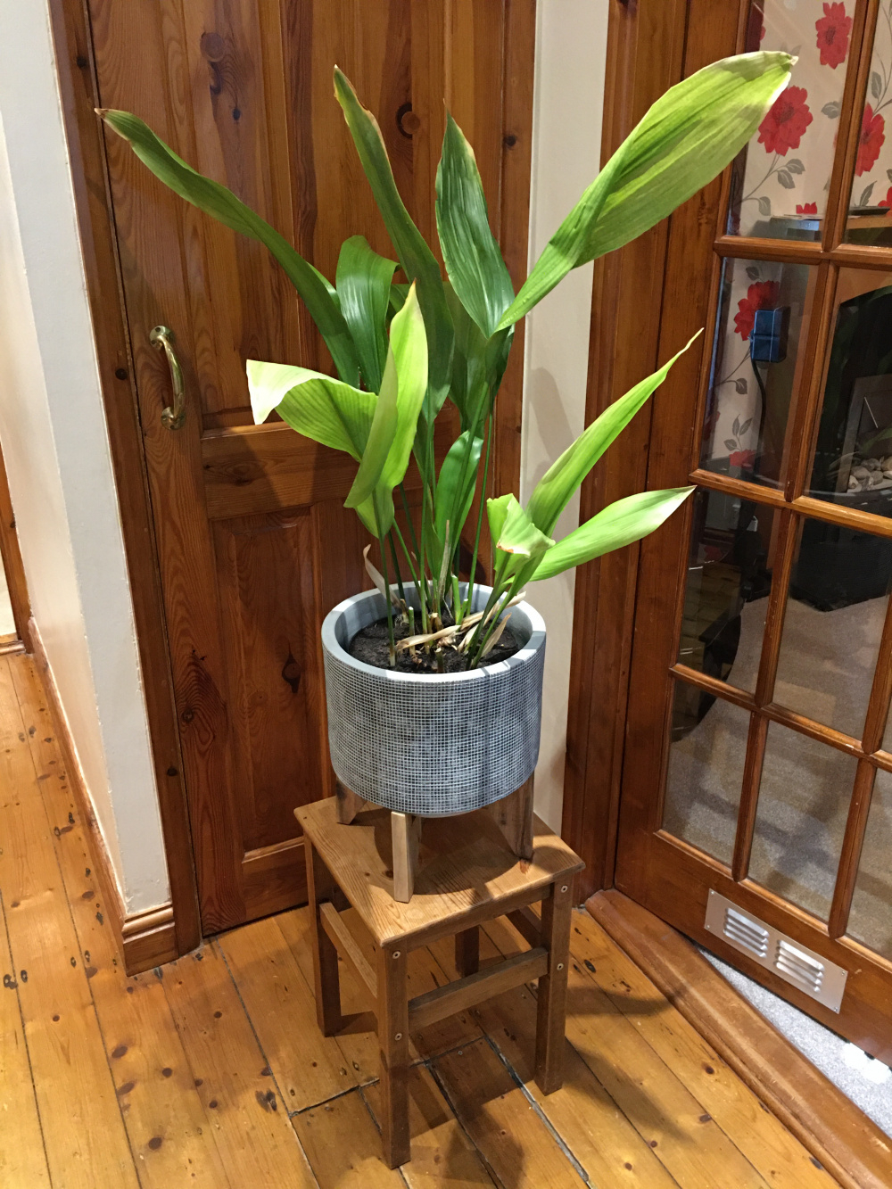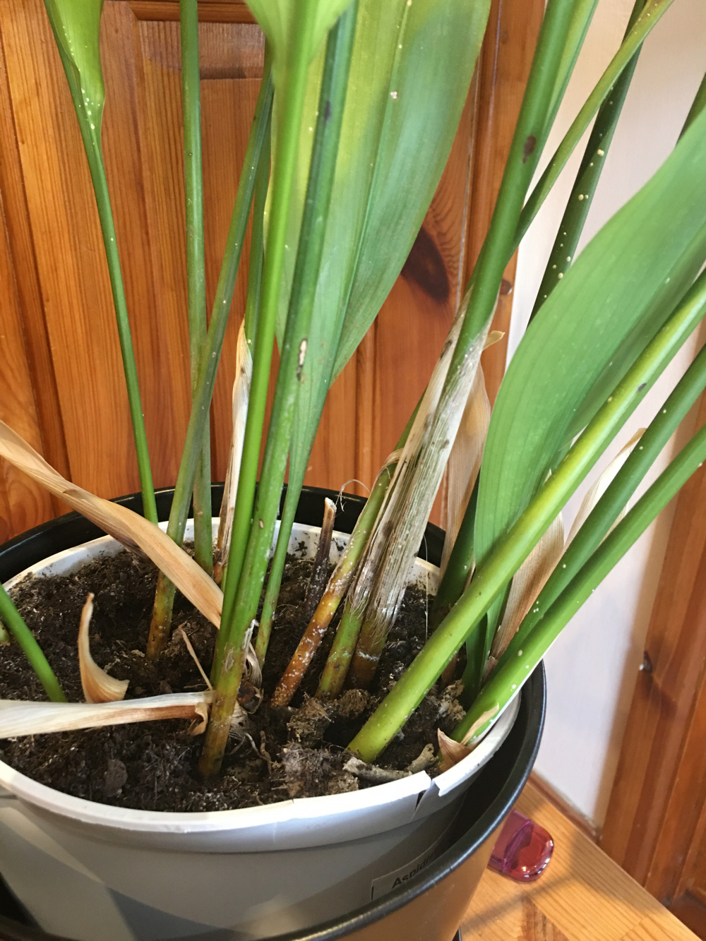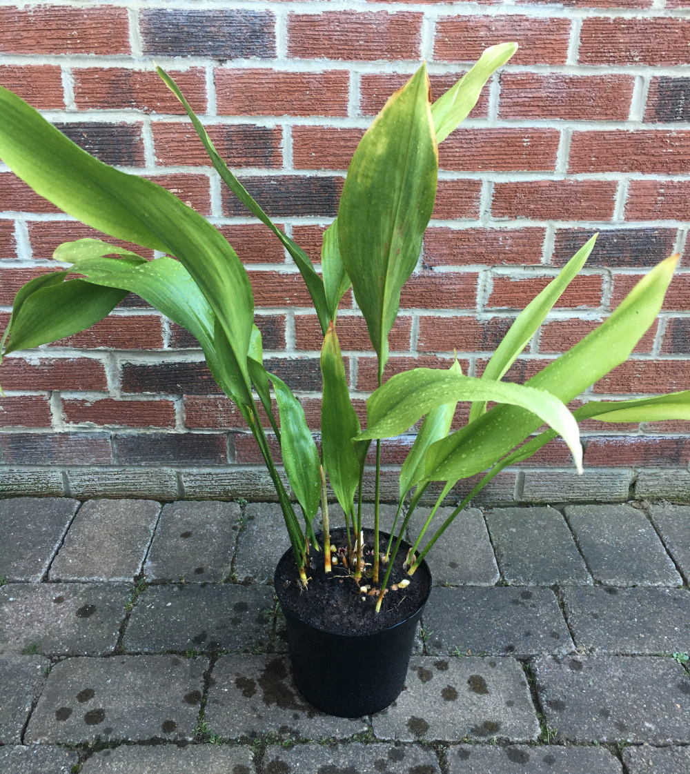 Pot-bound Aspidistra looks anaemic and has white spots on leaves