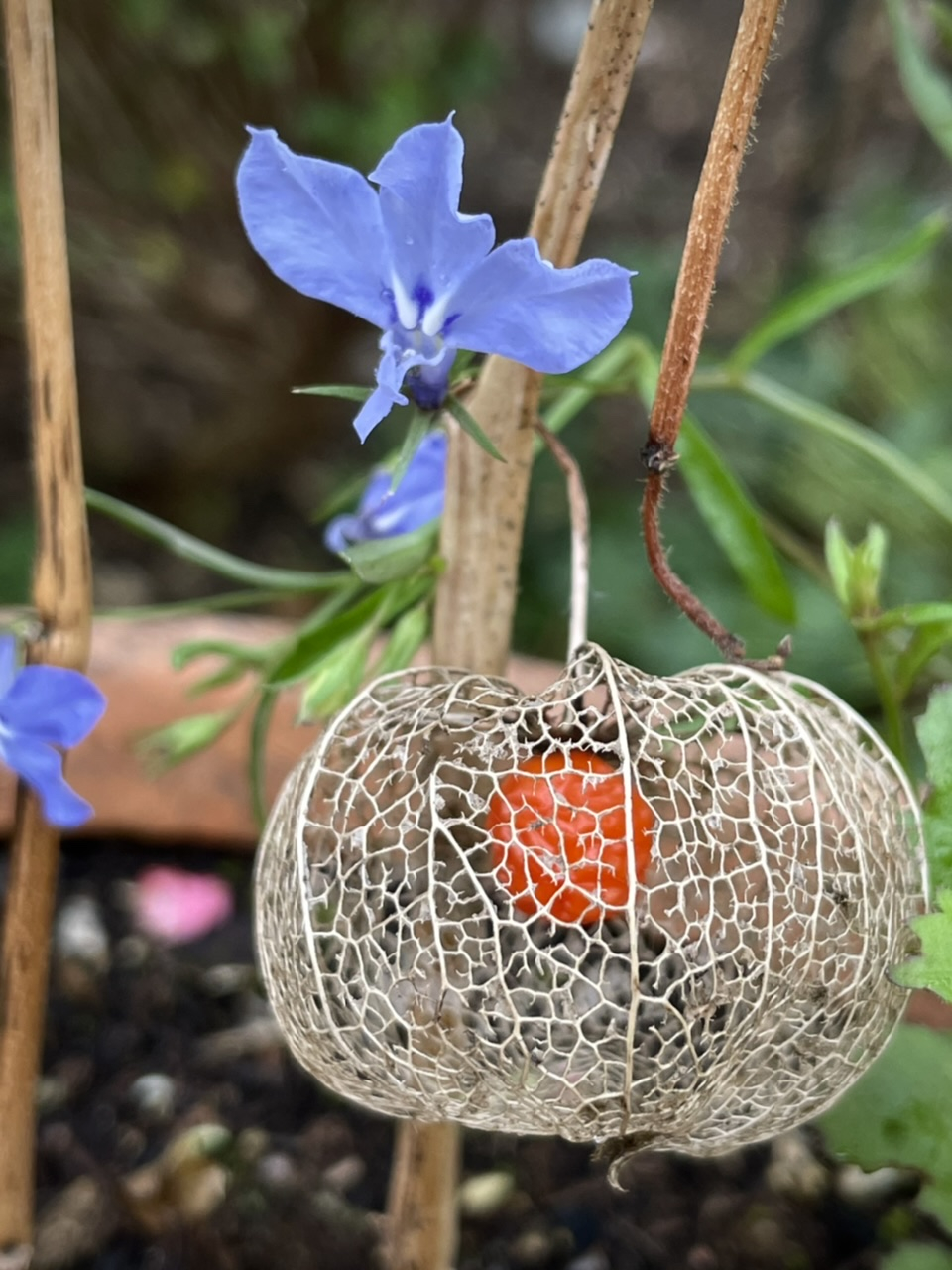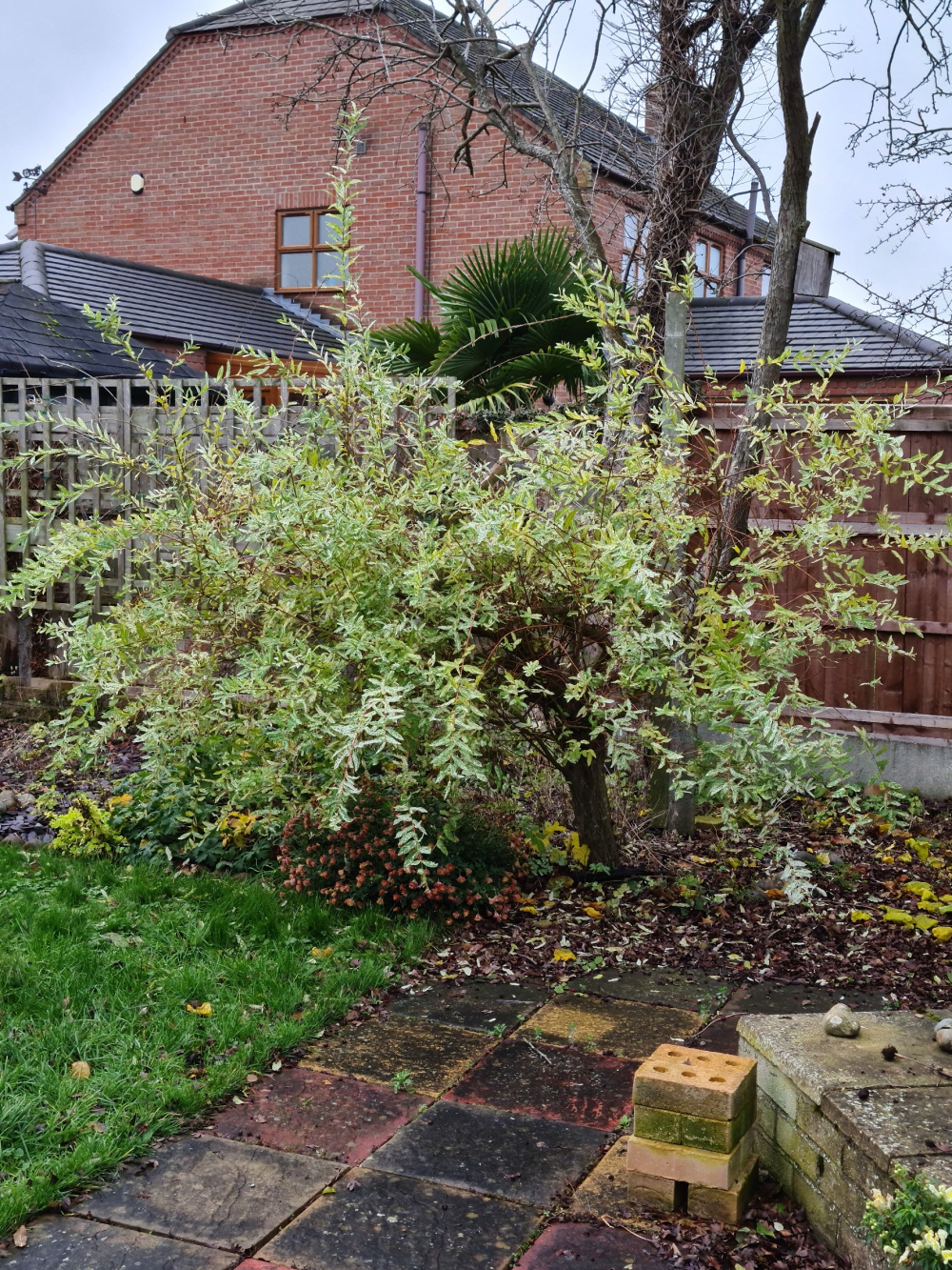 It is amazing after weeks of gale force winds, heavy rain, and frosts, their are still "beding plants" to be found in flower! I know this tree/bush is not everyone's favourite, but in winter I love it. This too has bounced back. My "dying" flamingo willow, cut back by over half in height, has rallied. It will even need a trim in spring. P.S. the bricks are the stand for the night camera.😁