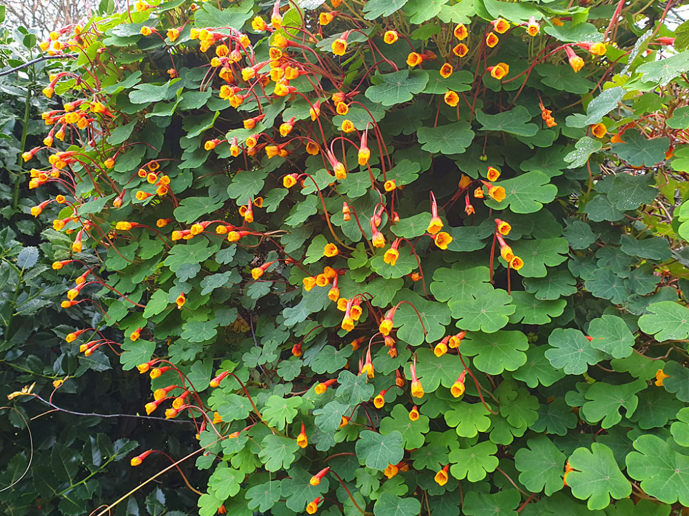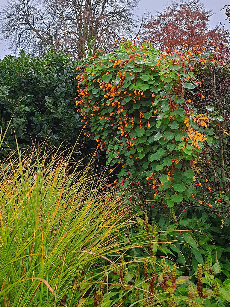 Not in my garden I admit but seen today in Sheffield Botanical Gardens. We weren't really expecting to see a flowering plant at it's peak in mid-November. Not fully hardy I'm told especially on their heavy clay soil but amazingly they forgot to take any cuttings last year and the parent plant survived! I know it's a Tropaeolum but not sure which one. Anybody?