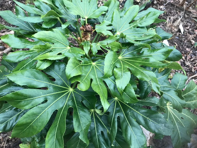 Your Fatsia looks a lot better than mine does, but I know mine will survive. They can manage surprisingly long spells of snow, ice and low temps