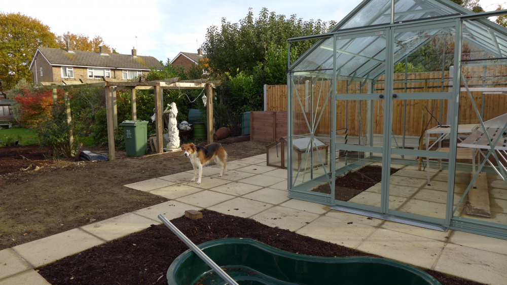 That part of my garden was a wilderness for many years and on a significant slope from left to right, so I had it all levelled, landscaped, raised fruit & veg beds and paved, then the greenhouse went on. The landscapers suggested the paving was done at a very slight angle (4°) so that rainwater doesn't puddle anywhere on the paving - it was a very good suggestion and 4° is not noticable - and no puddles anywhere.