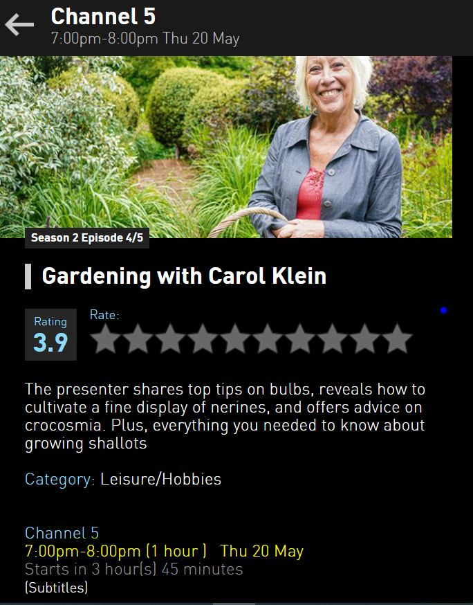 Really enjoying Carol Klein on Ch 5. Very informative and feels more like 'proper basic gardening' which is just what I like. I do enjoy watching MD as well but so far I am enjoying Carol's down to earth approach a bit more. Best of both worlds I suppose.
