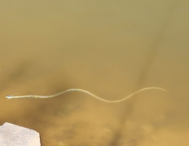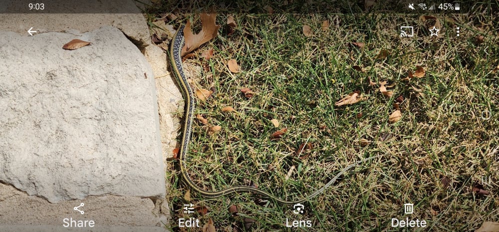 sorry for the poor picture but this nonpoisonous snake is very fast. We have lots of these pretty snakes. They are blue with a white stripe. I'm not sure what it is but I saw three mowing the grass.