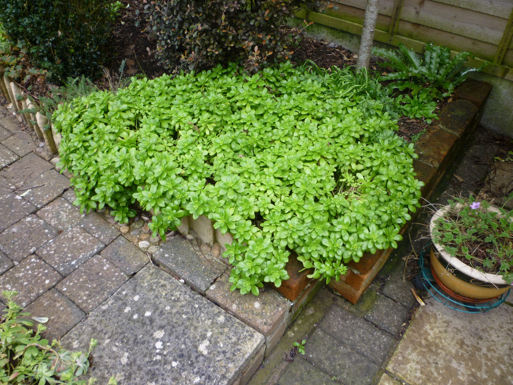 Arabis fernandii coburgi variegata. Takes a while to cover a large area though. The delicate white flowers are always the first thing to flower in our garden, in Dec/Jan.