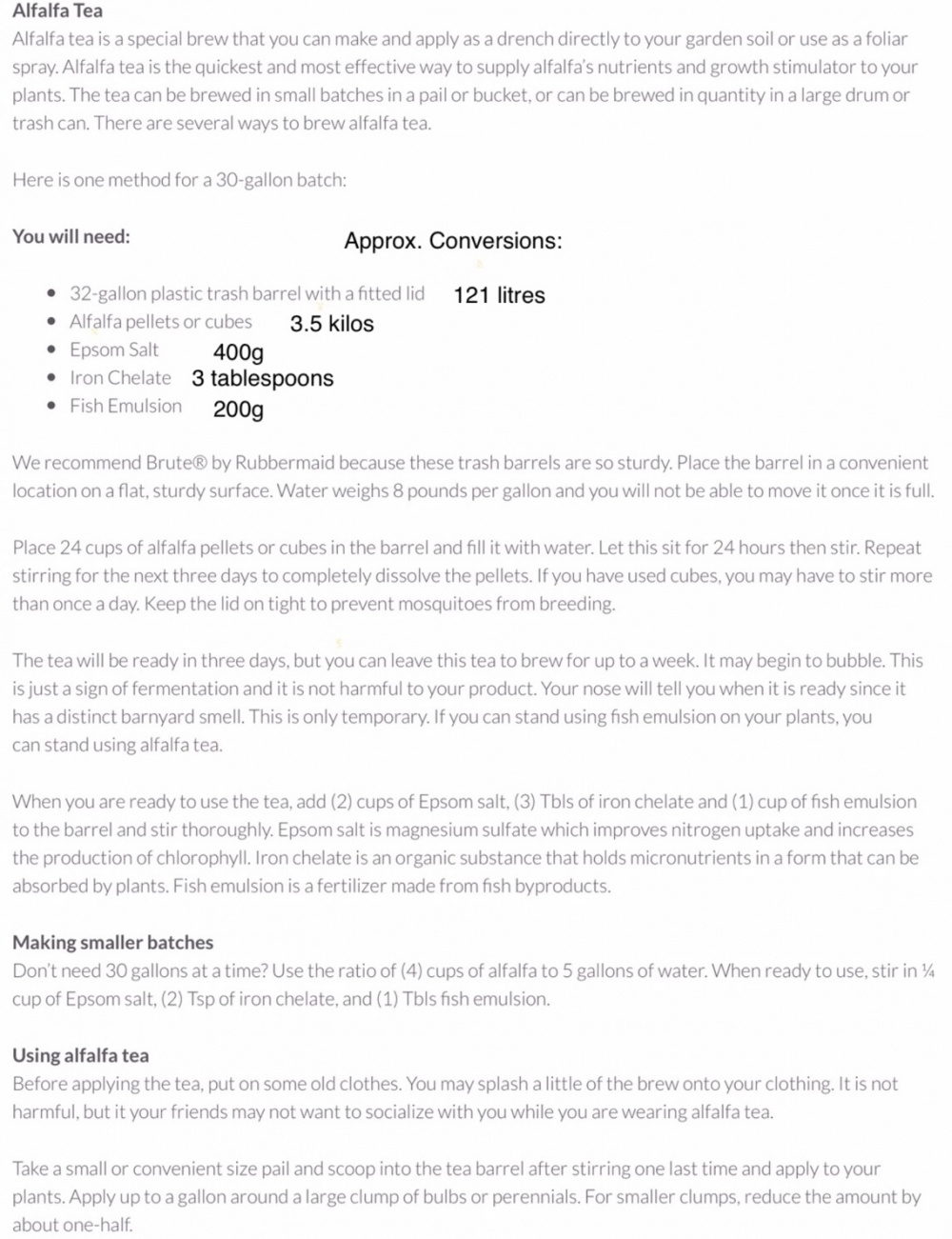My plan is to make Alfalfa tea (see recipe below) and to use this as an initial feed at the beginning of March, then use soluble sulphate of potash (similar to tomato feed) and liquid seaweed during the blooming season. I have a lot of roses and this regime works out cheaper than buying proprietary rose feed and tomato feed. As it’s an experiment, I can’t say how effective it will be.