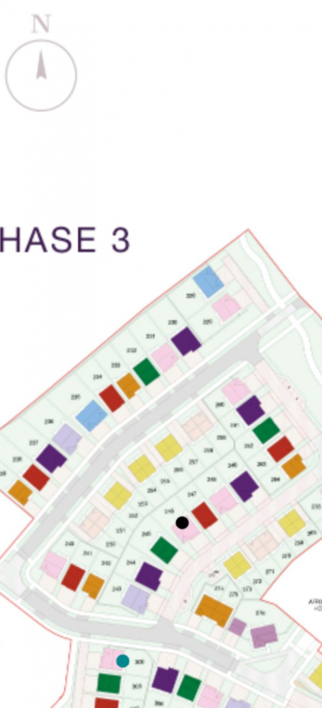 There is potentially another plot available with the same type of house. There is existing housing opposite. I have marked it on the attached photo in a blue/green dot. It is less overlooked but not sure about the sun again. How would it compare for sunlight?