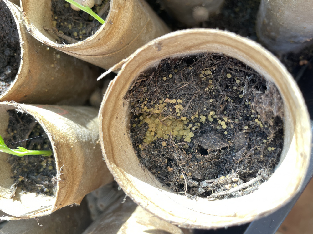 I used a shop bought compost for veg (it was all I had at the time), and soon after planting some green appeared on top which I assumed was mould but close up looks like eggs - what do you think? Egg of friend or foe?