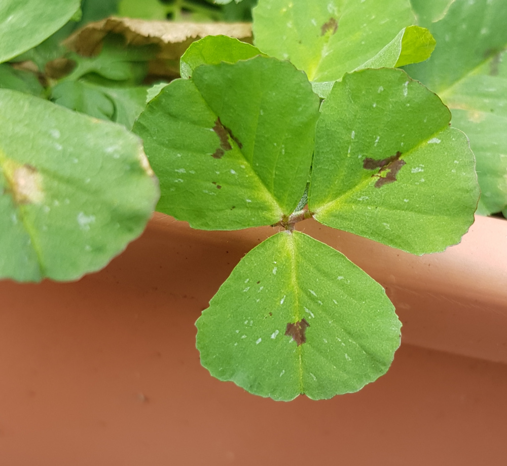 I never bothered to think what colour the markings are on Clover leaves before. But it seems they are white on our 'usual' Clover. So is this "Red-spotted clover" (or "Spotted Medic" apparently) - Medicago arabica. So probably a weed...