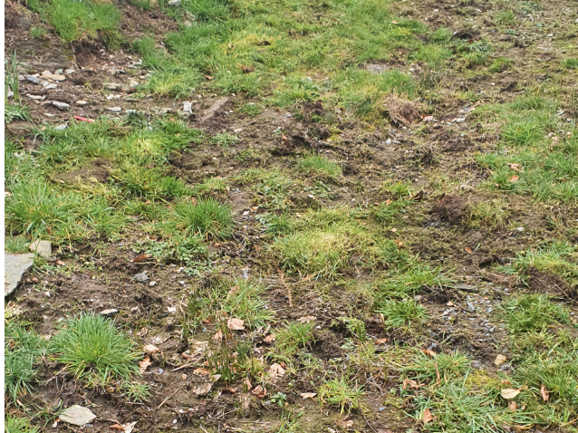 Bonus picture 3 of another area which is damper soil with clumps of grass near an exposed slate rock hill, I'm thinking dig this up, add new soil and plant grass or how would I fix that?