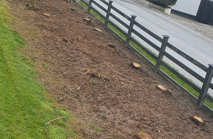 So basically what the title says, I want some grass in these areas below and I'm not sure how to go about it. History on this is there used to be a run of leylandi hedging (whole other story) and they were all cut down to the stumps. I was planning on planting a new hedge but now plan to leave it and keep it open for a while until we decide later. The ground is quite weedy (some roots of ivy in parts) and I'm thinking stumps will obviously cause an issue but if the majority was covered until just shy of the fence id be happy.