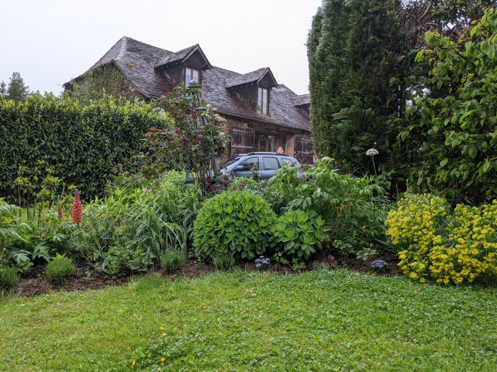 Pergola in, poor rose beaten about by rain though and the Euphorbia. I think the Sedum have got too big, but not sure quite what to do about it yet.