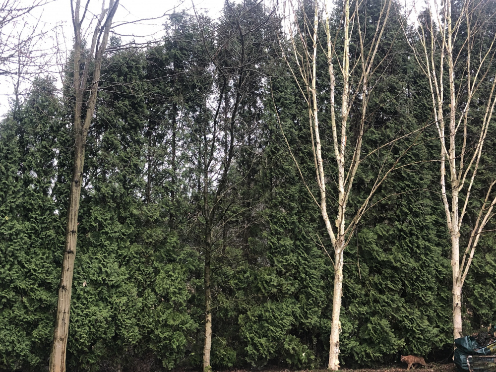 I've had these trees for 20 years and they have always kept a thick coverage but this year I have noticed there is a thinning half way up - please see photo - anyone have an idea what is happening here, the rest of the trees remain thick. Many thanks.
