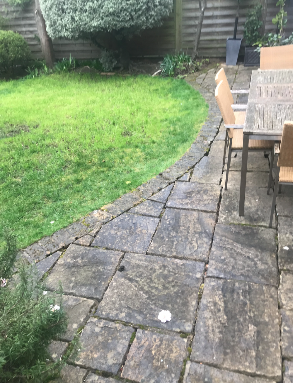 If you give those slabs a good clean with a Karcher pressure washer you may well find you can source something similar in colour and texture to fill the extra space. It'll weather again soon enough and any difference will not be glaring for long.