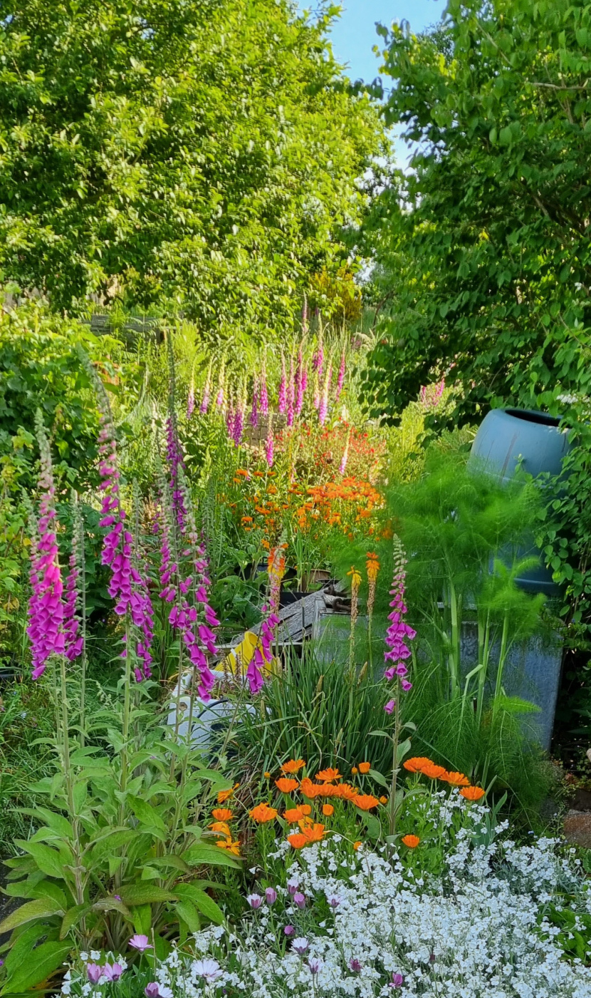 Wondering what options there are for planting in front to keep it cool, as it's in full sun/south facing, I would like to be able to see a up the garden a little and have a veg patch behind so don't want to block too much, therefore nothing too tall. The pots are there for now, as are the cobble stones.