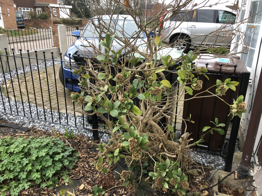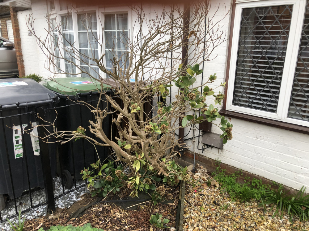 I had to cut back the foliage of my evergreen skimma bush that I inherited last summer. Previous owners had planted it close to the boundary and my neighbours were erecting a nice new fence. It then started to lose leaves and progressively got worse. There are still leaves from the middle down, but the top is twigs! Should I prune these off or will the leaves regrow as spring comes?