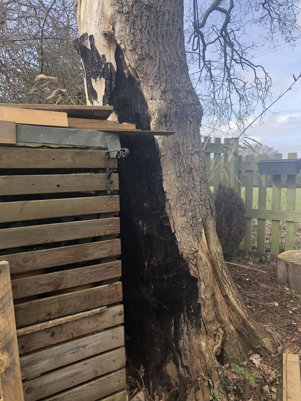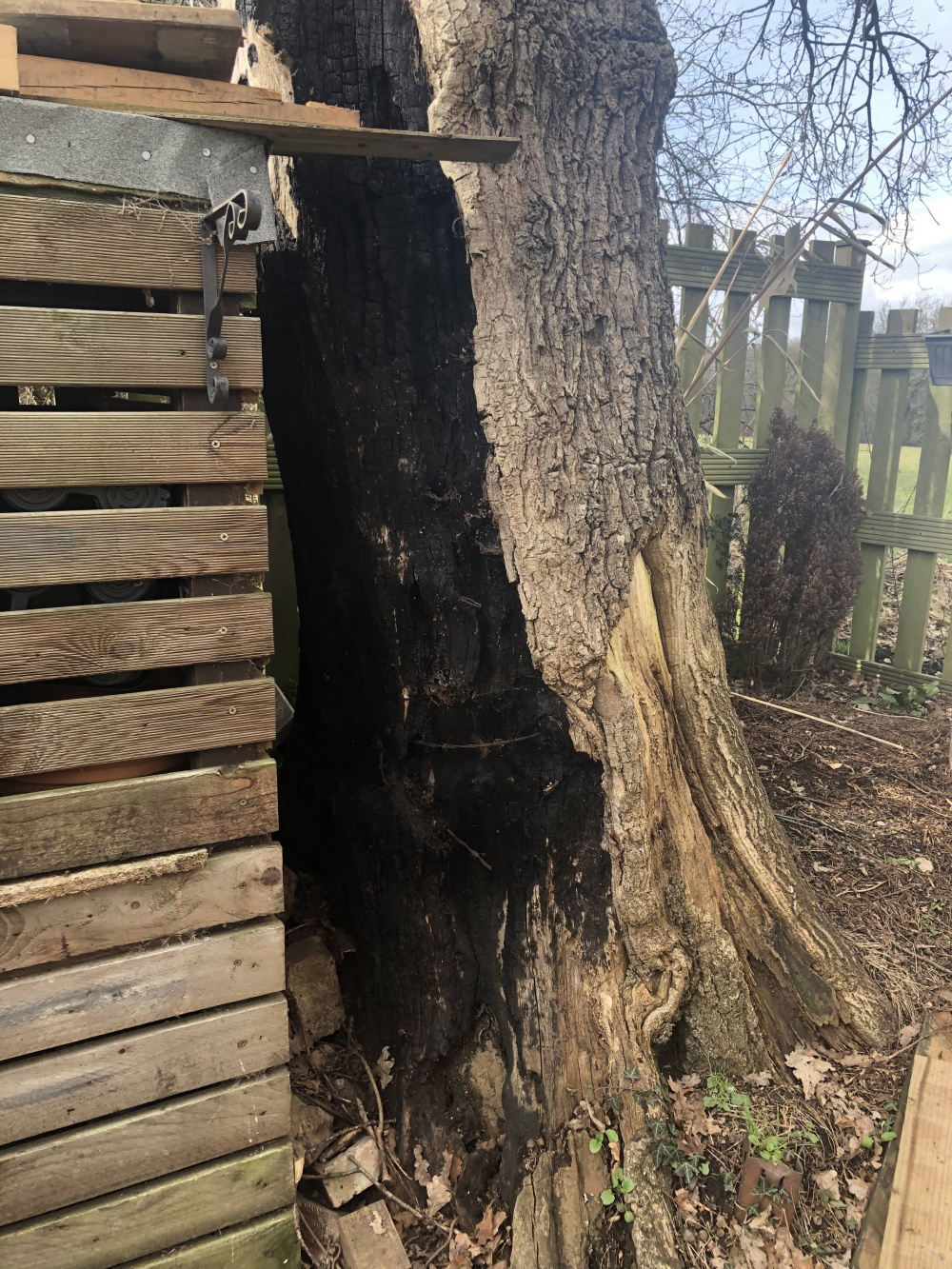 I had some great advice so far, so here is one of my trickier questions. The previous owner had the very smart idea to have a fire pit right underneath the oak tree at the end of the garden. He managed to burn the tree, its black and a lot of the bark is gone. I had a tree surgeon check it out and the tree is ok, it’s a bit slower coming into leaf than his siblings (by about three weeks) but by summer you wouldn’t notice the difference. The oak tree is 91 years old ( it was planted the same year as the house was build