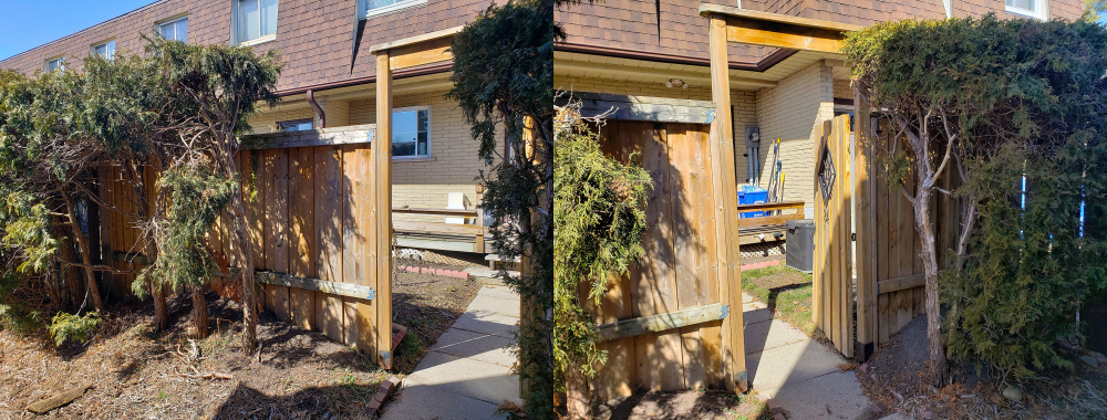 Thanks everyone for the advice - ahead of time. Just moved into a quaint townhome and wondering if there is anything I can do to get his hedge to regrow and possibly connect with each other over the gate?