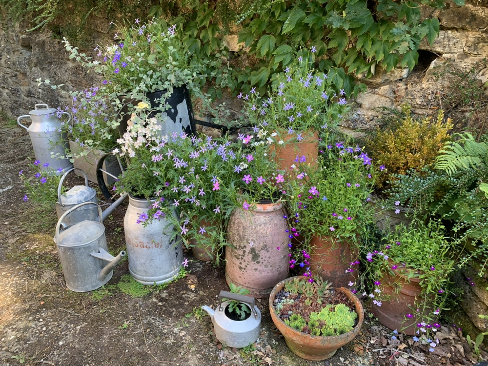 Chimney pots, a rhubarb forcer, milk churns, a watering can, a kettle, a water barrow and a walls ice cream box 😀. Some picked up at reclamation yards, some found in the undergrowth of this garden when we moved in ....