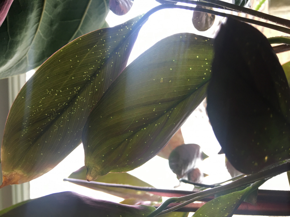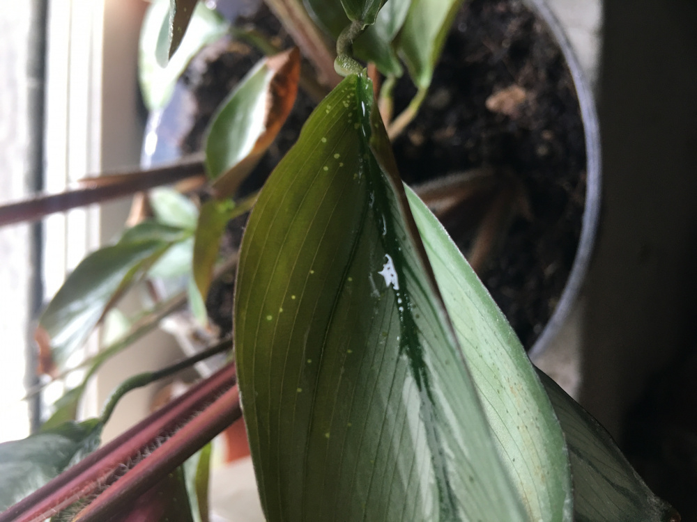 we are in need of some help identifying what sucking the sap out of our beautiful Ctenathe leaves, we have looked all over the web for an identification but can not find what it is.