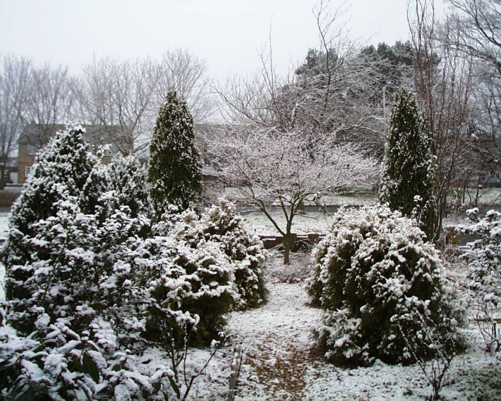 This photo is from about 25yrs ago. The prunus is the tall skinny bare thing right next to the pointy conifer on the right. It was not long after I moved in and I was way too enthusiastic with my planting
