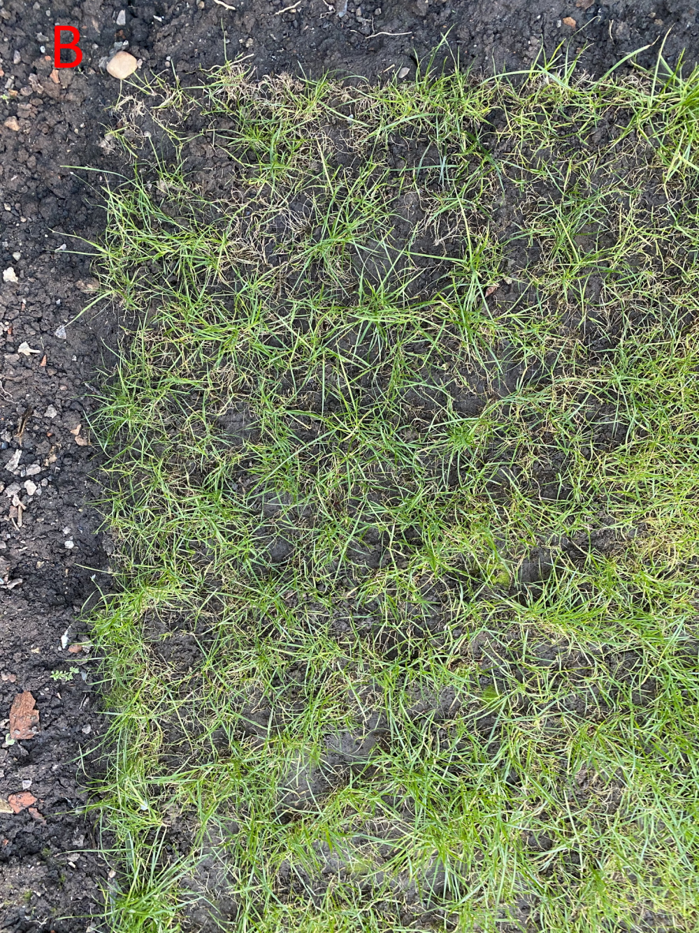 The left side of the grass is more in the shade and I feel it holds dampness longer, this is the side where the bare patches are more noticeable...but that could also be down to having a two year old running around on it! Picture B being the top left corner of the garden.