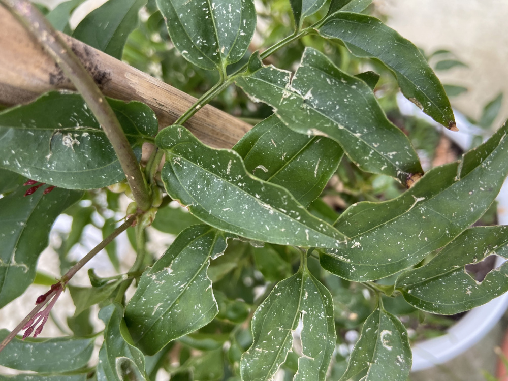 I have never grown a Jasmine before. It’s been growing quite well and is taller than me now, although over the last few weeks all of the leaves are showing with this kind of damage. It’s in a pot on a patio and I feel like it may have been dried out and damaged by wind as it is at a corner where it might be too exposed (in an effort to hit the summer sun just right). Otherwise I have found one little snail in it, but that’s all. Does anyone have a diagnosis?