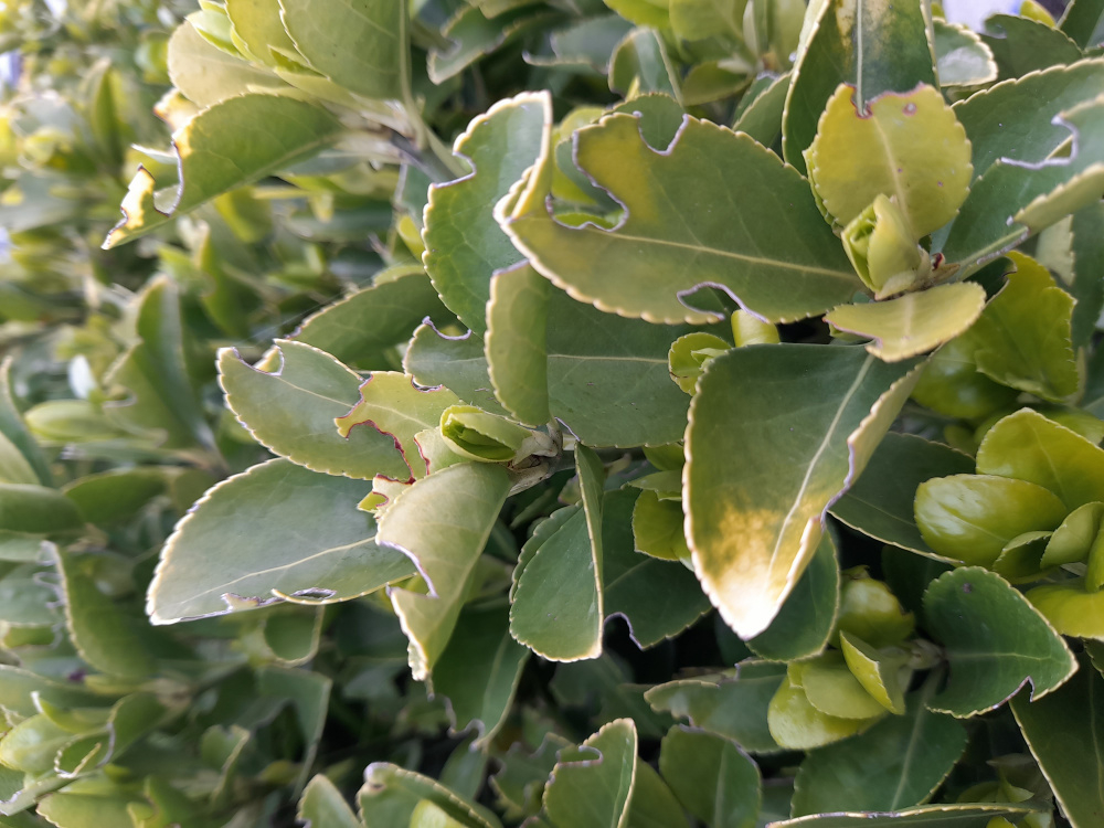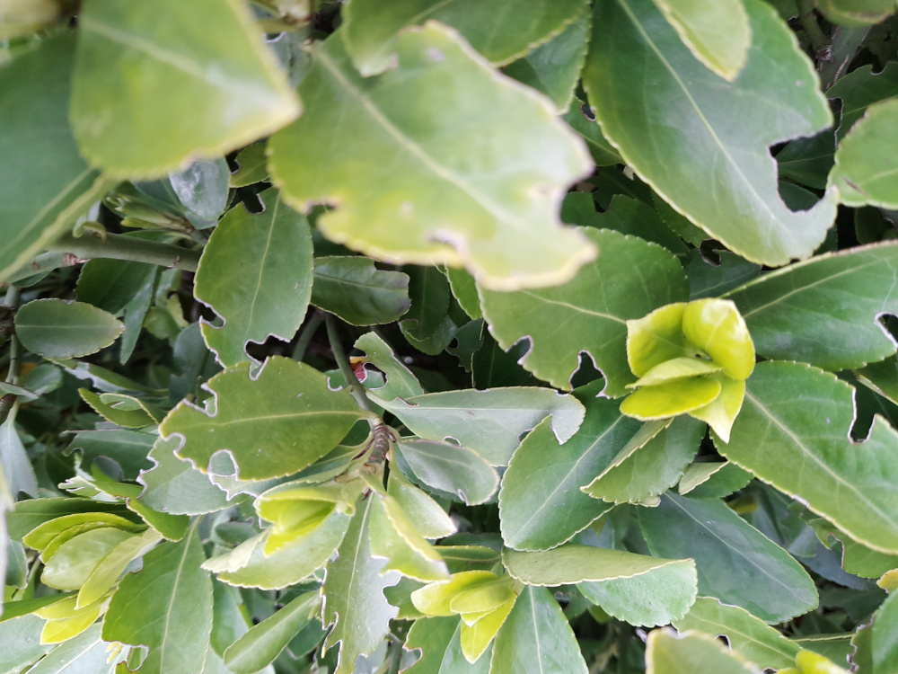 We have a large Japanese Euonymus hedge. Each year the fresh green leaves get munched and the hedge is not thriving. The photos below show last years damage. The fresh green leaves at the moment are ok.