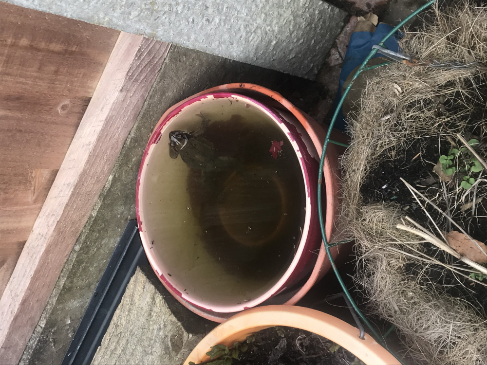 we have discovered (much to our delight) a frog has spawned in a deep ceramic plant pot in our garden.