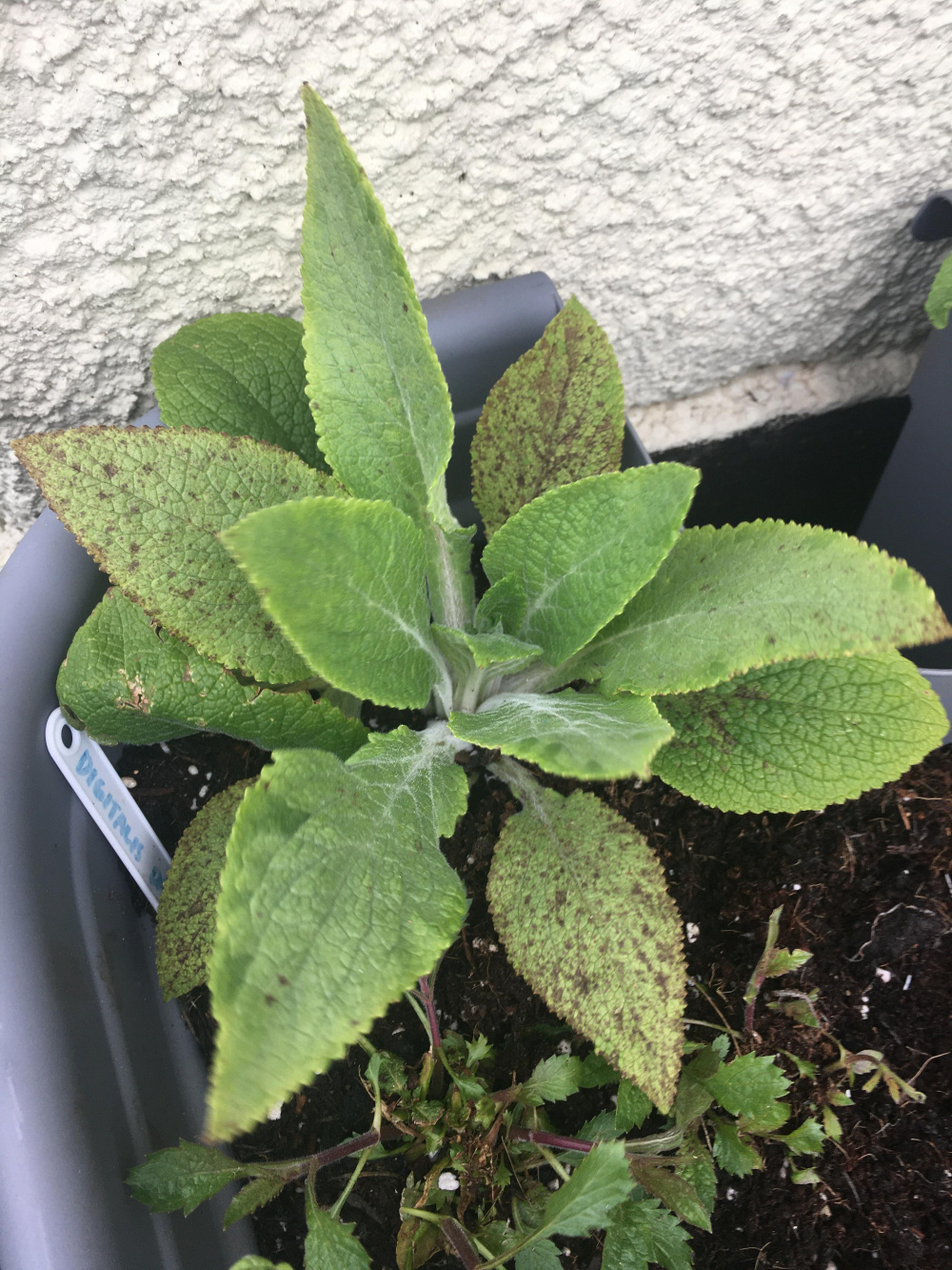 My foxgloves in containers have all suddenly gotten these spots in their leaves - not sure if it's a fungal issue, not enough nutrition etc.