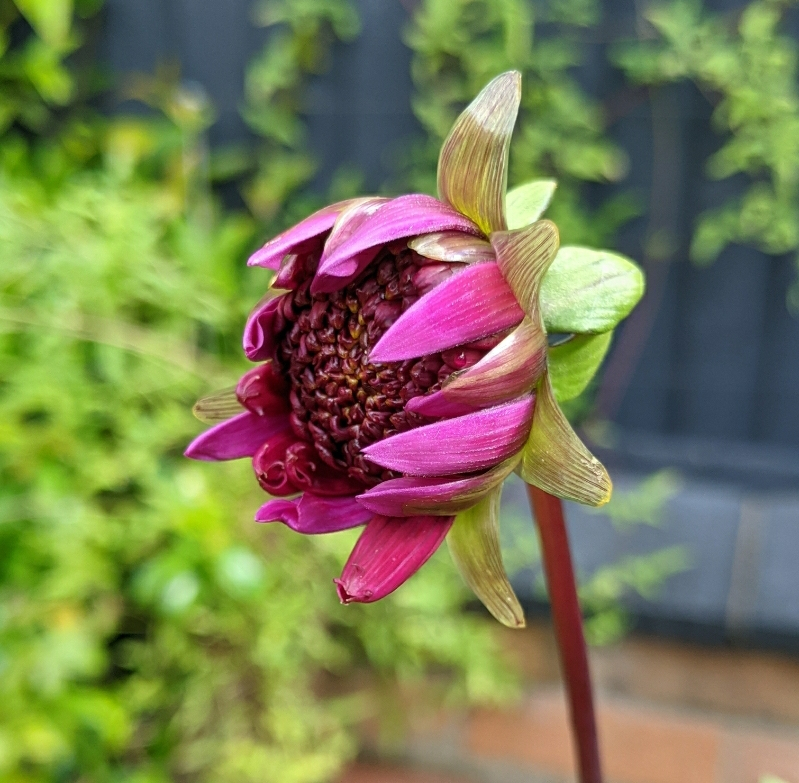 Blue Bayou has opened its first flower, this was Sunday morning as the bud finally unfurled. So much later than my other dahlias, which started in early June.