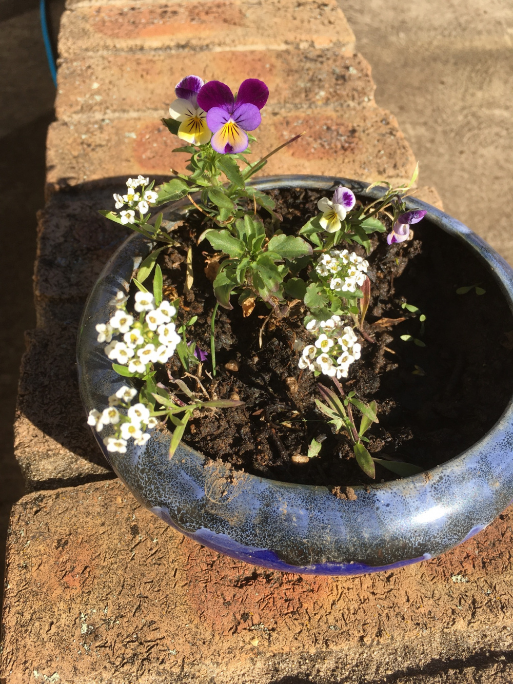 On a happier note, I rescued some Viola tricolour and Allysum that had self seeded and I transplanted them into a little pot. I like looking out of the window each morning when I draw back the curtains and enjoying their bright faces.