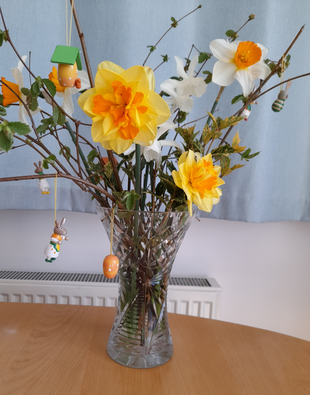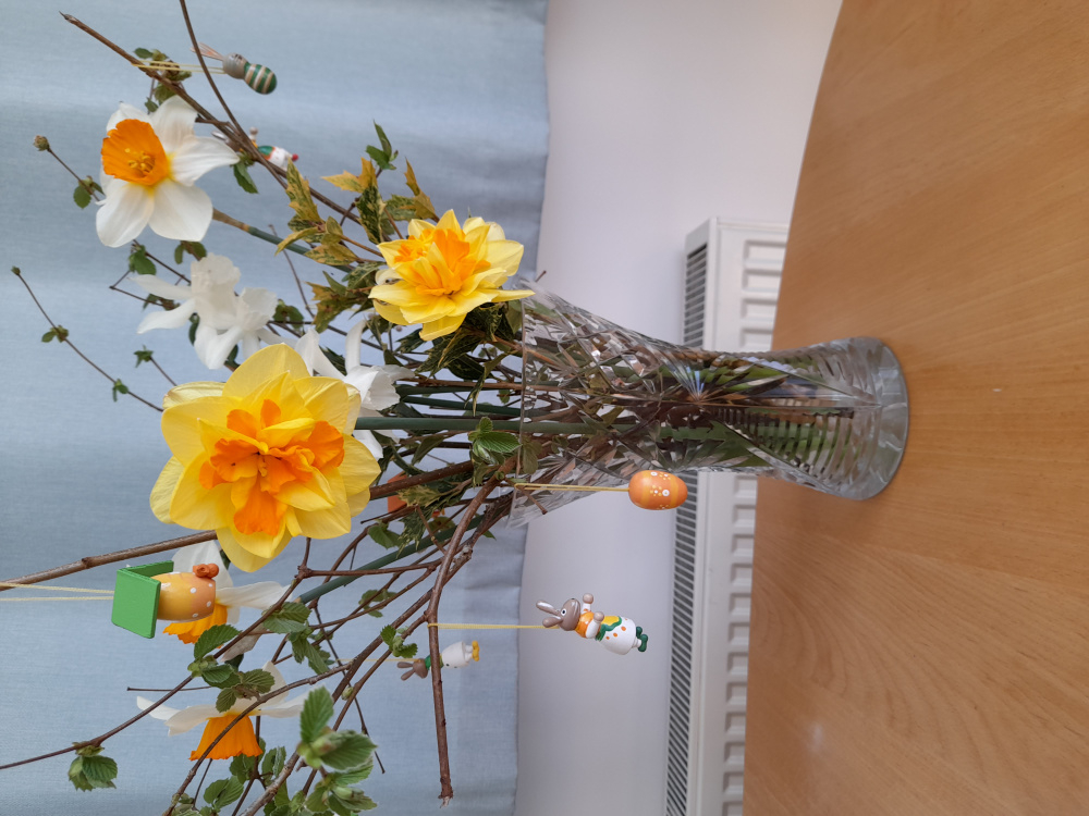 Happy Easter everyone and Happy Birthday @WonkyWomble. It's glorious here today, why couldn't it have been yesterday for our family picnic! Haven't done much so far as woke up early at 4 am and had a cup of tea, then went back to bed so slept late. Lots of trips up and down our steepish drive, completely filling daughter's car with all the plants I've been potting up for her since she moved to her new place. She's just left for the 2.5 hr trip back to Devon. Can anybody identify the double yellow with orange centre daffodils please? She's very taken with those. Sorry about the double photos, posted the first, then remembered the tip about editing them to make it the correct way up, so had another go. I've had those Easter decorations about 8 years since the grandchildren were small - they still make me smile.