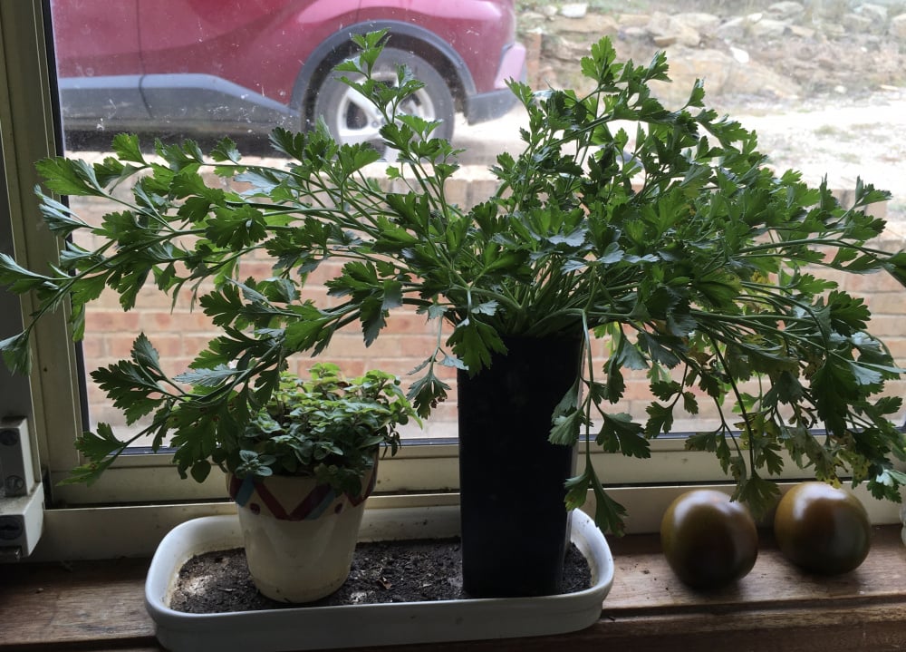 I dug up one of my parsley plants and popped into a tube pot to fit on my narrow kitchen windowsill for convenience. Love parsley on tomato at breakfast. I usually spread my toast with Aldi’s goat cheese and then a slice of Black Russian tomato and a leaf or two of the parsley. Yum! 😜
